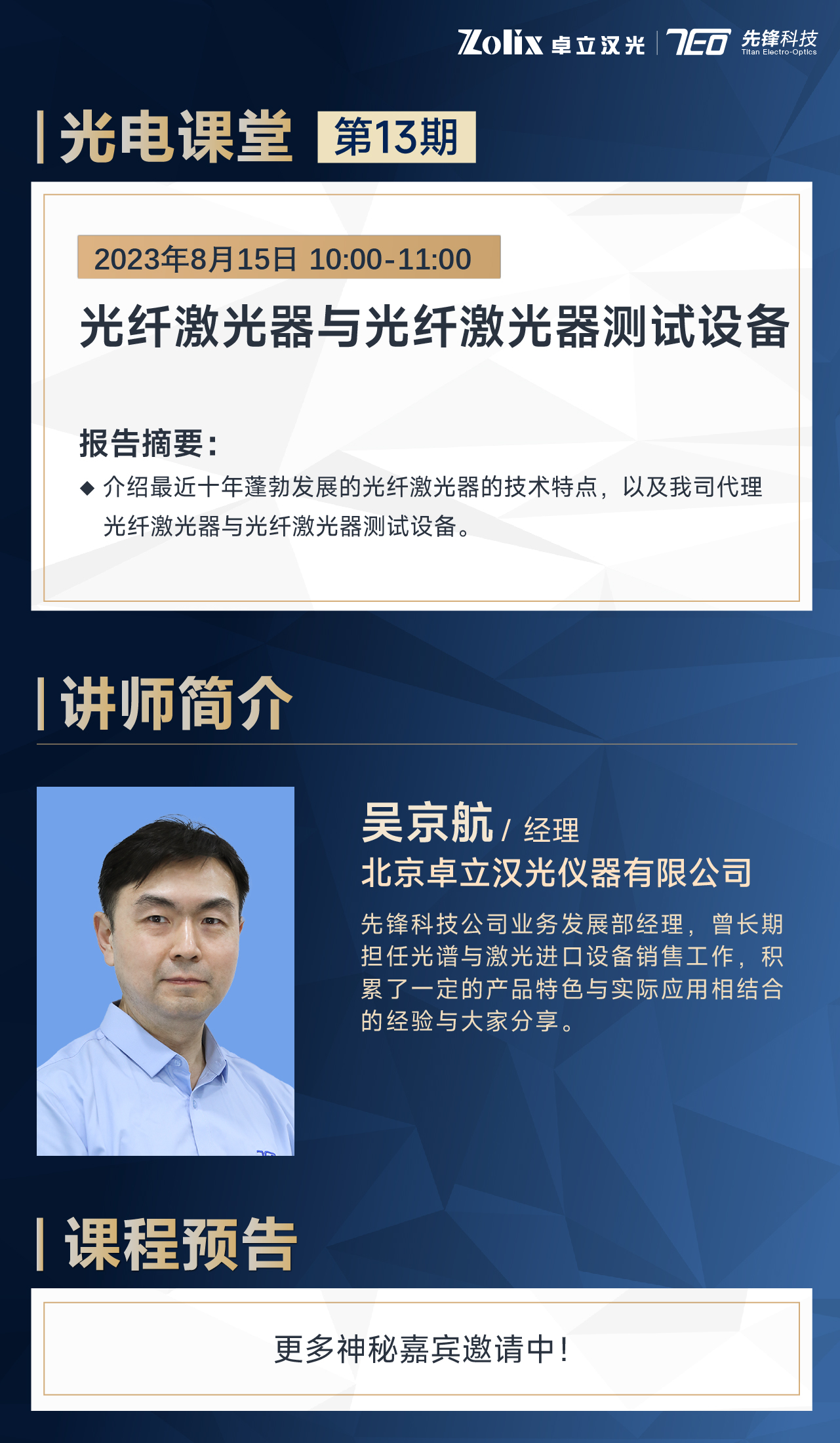 8月15日上午10:00—11:00北京卓立漢光儀器有限公司 業(yè)務(wù)發(fā)展部—吳京航經(jīng)理將為我們帶來(lái)光纖激光器與光纖激光器測(cè)試設(shè)備的介紹,分享*近十年蓬勃發(fā)展的光纖激光器的技術(shù)特點(diǎn),以及我司代理光纖激光器與光纖激光器測(cè)試設(shè)備。直播期間更有豐富好禮相送,歡迎屆時(shí)參加!