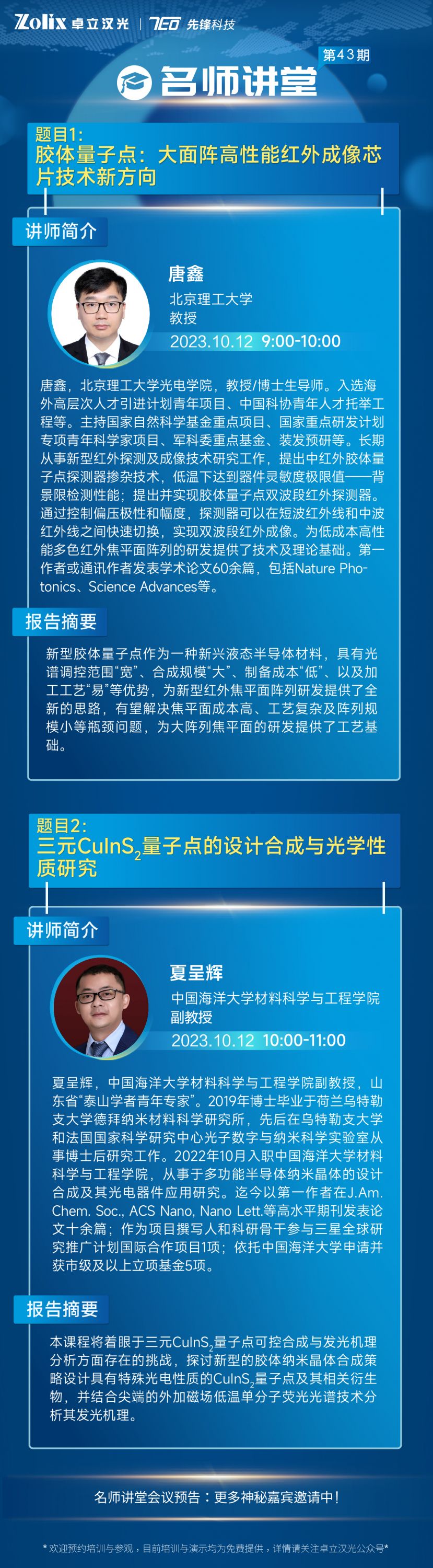 為了與大家共同感受諾貝爾化學(xué)獎(jiǎng)-量子點(diǎn)的科技魅力,本期卓立漢光特別隆重邀請(qǐng)到了北京理工大學(xué)—唐鑫教授和中國(guó)海洋大學(xué)材料科學(xué)與工程學(xué)院—夏呈輝副教授,與大家分享在膠體量子點(diǎn)研究領(lǐng)域的經(jīng)驗(yàn)和心得體會(huì),希望本次講座能夠?yàn)槟目茖W(xué)研究帶來(lái)靈感與助力,推動(dòng)研究的進(jìn)展,精彩不容錯(cuò)過(guò),趕快報(bào)名開(kāi)啟學(xué)習(xí)之旅吧~