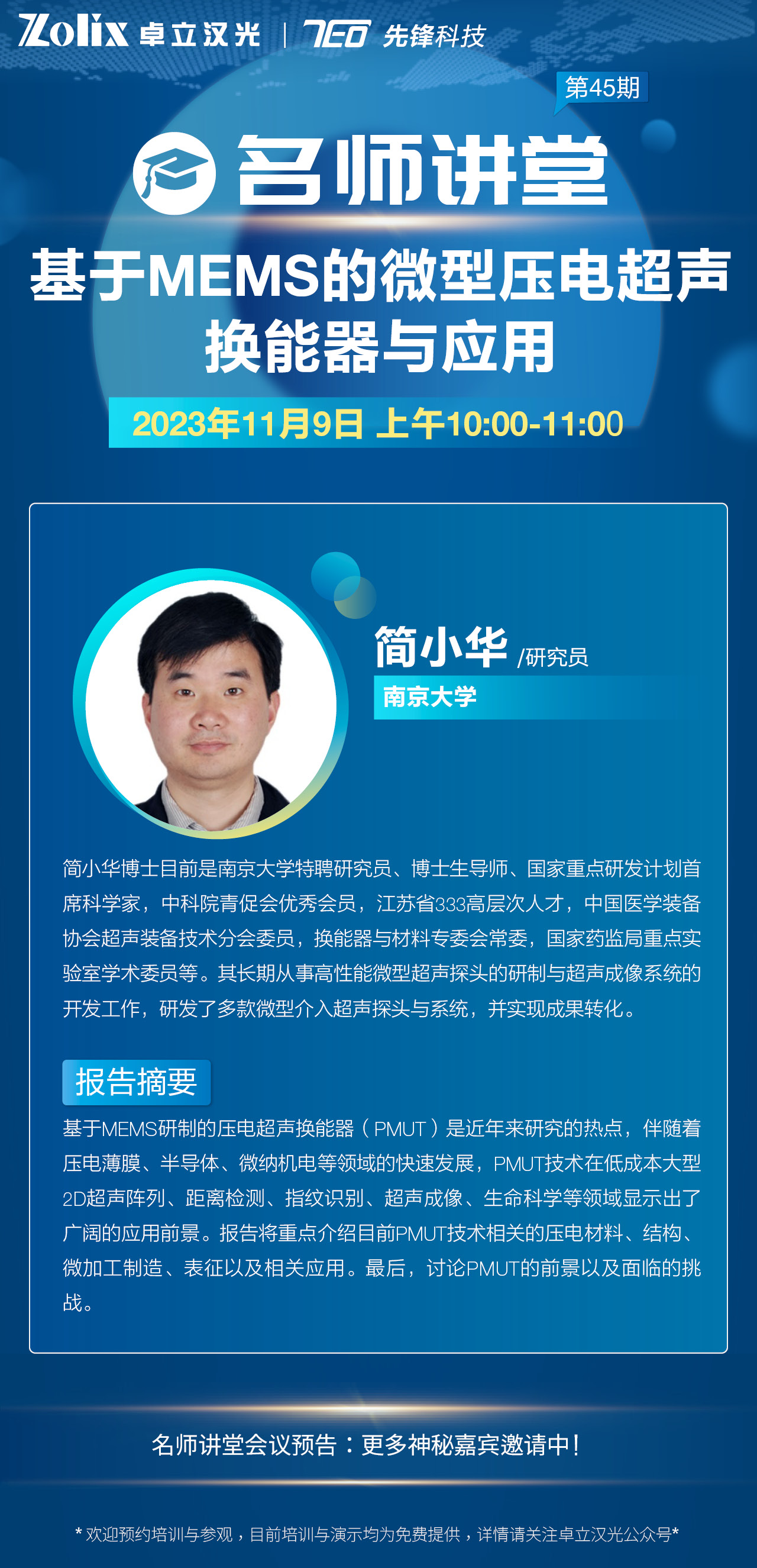 本期隆重邀請(qǐng)到了南京大學(xué)特聘研究員—簡(jiǎn)小華研究員,與大家分享自己科研領(lǐng)域的經(jīng)驗(yàn)和心得體會(huì),他帶來(lái)的講座題目是《基于MEMS的微型壓電超聲換能器與應(yīng)用》,希望本次講座能夠?yàn)槟目茖W(xué)研究帶來(lái)靈感與助力,推動(dòng)研究的進(jìn)展,精彩不容錯(cuò)過,趕快報(bào)名開啟學(xué)習(xí)之旅吧~