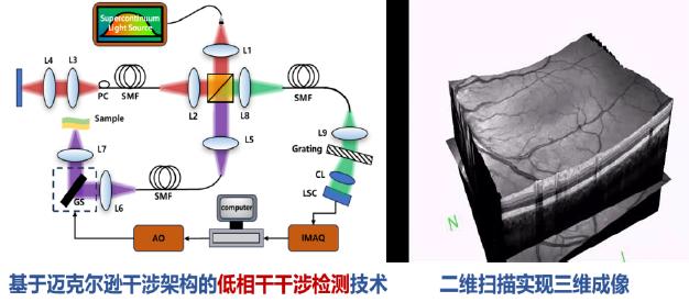 光學(xué)相干層析成像技術(shù)(OCT)是一種基于邁克爾遜干涉的低相干干涉,能實現(xiàn)三維面形和缺陷的同步檢測,近年寬帶光源發(fā)展和高速采集技術(shù)進(jìn)步,在mm級深度的分辨率達(dá)到共聚焦顯微鏡水平(Micro-OCT)。