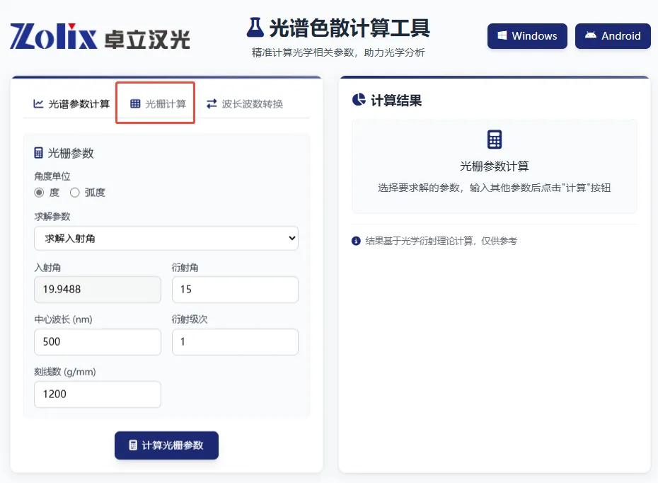 近日,卓立漢光官網新上線光譜色散計算工具,專為譜儀與線陣探測器的性能參數(shù)計算打造,能幫您高效解決核心計算需求。這款工具基于光柵方程進行理論計算,可快速輸出關鍵性能參數(shù),包括分辨率、光譜覆蓋范圍,以及光柵的色散能力?,F(xiàn)開放至網頁端,希望能為行業(yè)內有需要的研發(fā)及技術人員提供便利。