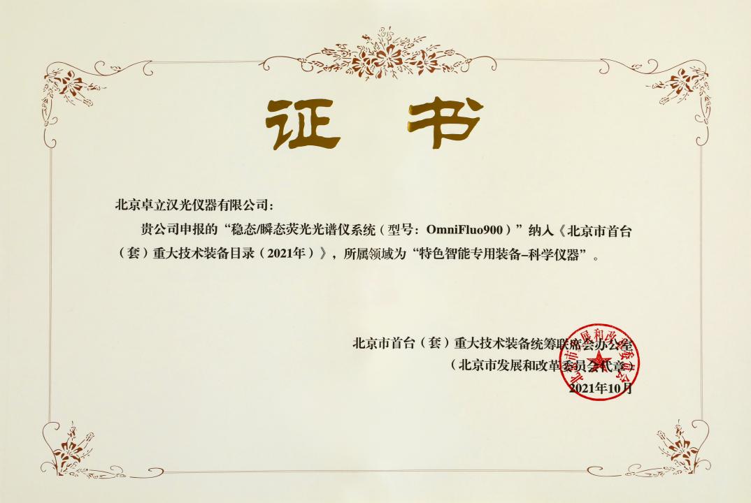 10月22日下午,由北京市首臺(tái)(套)重大技術(shù)裝備統(tǒng)籌聯(lián)席會(huì)辦公室、市發(fā)展改革委牽頭組織的2021年全國大眾創(chuàng)業(yè)萬眾創(chuàng)新活動(dòng)周北京會(huì)場“2021年首臺(tái)(套)重大技術(shù)裝備授牌暨項(xiàng)目路演活動(dòng)”在中關(guān)村國家自主創(chuàng)新示范區(qū)展示中心舉辦。卓立漢光攜穩(wěn)態(tài)/瞬態(tài)熒光光譜儀(型號(hào):OmniFluo900)參加此次首臺(tái)(套)產(chǎn)品的征集和認(rèn)定。
