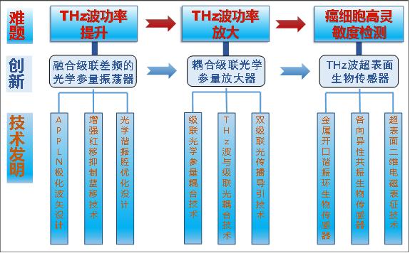 鑒于上述領(lǐng)域?qū)Ω吖β蔜Hz波輻射源的亟待需求,本項(xiàng)目針對(duì)THz波功率提升、THz波功率放大和癌細(xì)胞高靈敏度檢測(cè)三個(gè)國(guó)際科技難題展開(kāi),在2項(xiàng)國(guó)家自然科學(xué)基金項(xiàng)目和1項(xiàng)河南省自然科學(xué)基金的資助下,歷時(shí)8年取得了3大科技創(chuàng)新,形成了9項(xiàng)關(guān)鍵技術(shù)發(fā)明,如圖1所示,大幅度提高了THz波功率及量子轉(zhuǎn)換效率。