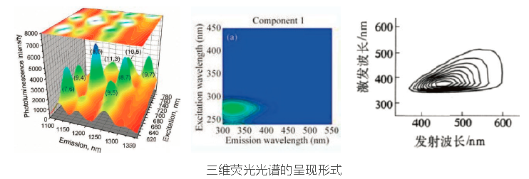三維熒光光譜的呈現(xiàn)形式如右圖所示,左圖為三維熒光光譜數(shù)據(jù)的三維立體圖形,中間圖形為三維熒光光譜的Z 軸投影,右圖為三維熒光光譜的等高線圖形。