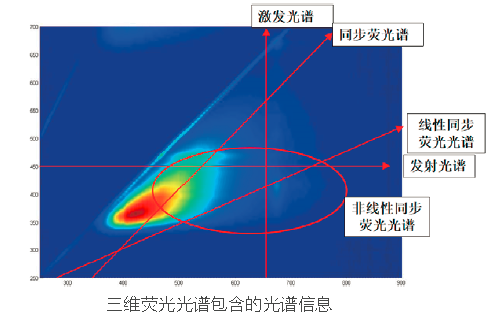 三維熒光光譜包含的光譜信息如右圖所示,分別為激發(fā)光譜、發(fā)射光譜、同步熒光光譜、線性同步熒光光譜、非線性同步熒光光譜。不難看出,一幅三維熒光光譜包含了我們現(xiàn)在所研究的大部分的熒光光譜信息( 激發(fā)光譜、發(fā)射光譜和同步熒光光譜) 以及我們?cè)诙S熒光光譜上無(wú)法觀測(cè)的光譜信息( 線性同步熒光光譜和非線性同步熒光光譜)。