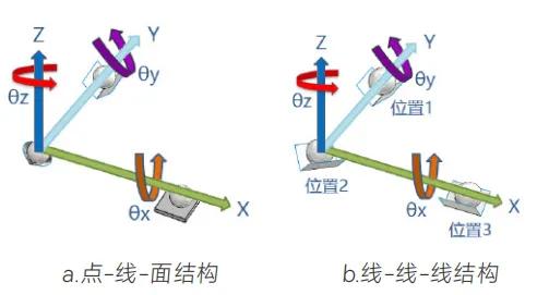 光學(xué)調(diào)整架的非共面調(diào)整機(jī)構(gòu)中,為了約束其它自由度方向的偏移,通常有 “點(diǎn)-線-面” 和 “線-線-線” 的結(jié)構(gòu)形式(參見圖7):