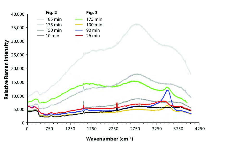 圖 反應(yīng)氣體的拉曼光譜強(qiáng)度- 時間關(guān)系圖和熱刨面圖
