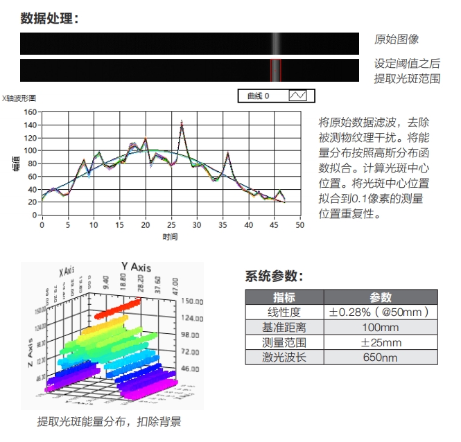 激光位移傳感器是被廣泛應(yīng)用的一種激光測(cè)距系統(tǒng)。原理是將發(fā)射點(diǎn)、目標(biāo) 點(diǎn)、接收點(diǎn)三者構(gòu)成一個(gè)空間三角形。通過已知的發(fā)射點(diǎn)和接收點(diǎn)兩者位置來算 出目標(biāo)點(diǎn)的位置。本系統(tǒng)是對(duì)激光三角法的有效驗(yàn)證。在實(shí)驗(yàn)條件狀態(tài)下,我們 是通過線陣相機(jī)記錄在全量程范圍內(nèi)的光點(diǎn)位置信息??赏ㄟ^標(biāo)定數(shù)據(jù)的方式使 光點(diǎn)位置和測(cè)量距離形成映射,達(dá)到測(cè)量位移的目的。可用于測(cè)距儀原理演示實(shí) 驗(yàn)、光點(diǎn)位置信息讀取算法驗(yàn)證、位置標(biāo)定算法驗(yàn)證等場景。