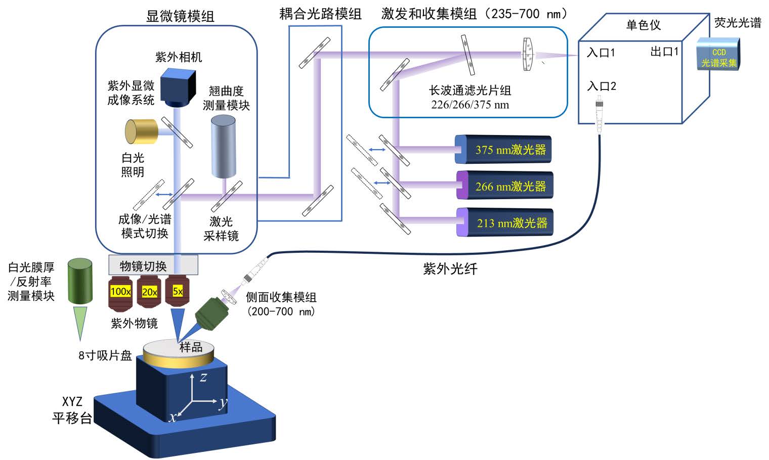 5X紫外物鏡,波長范圍200-700 nm。應(yīng)用于213 nm、266nm的紫外激發(fā)和側(cè)面收集實(shí)現(xiàn)AlGaN紫外熒光的測量 |