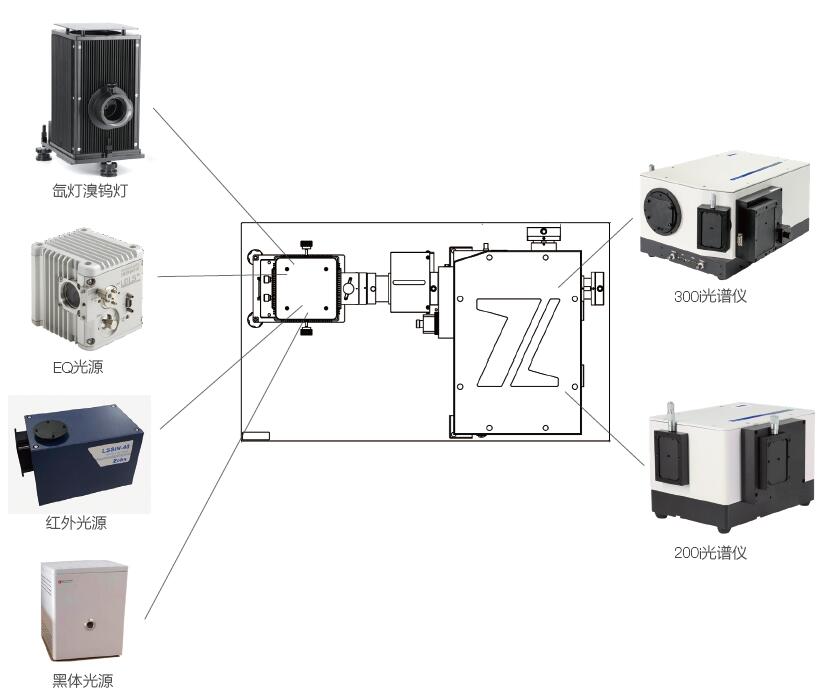 可調單色光源由復色光源與單色儀組合而成,如下圖所示,復色光源耦合進入單色儀,經(jīng)過單色儀的分光而形成單色光。配合卓立漢光各種型號規(guī)格的配置,可以搭建各種類型的可調單色光源:光纖輸出模式,空間輸出模式,積分球輸出模式等。