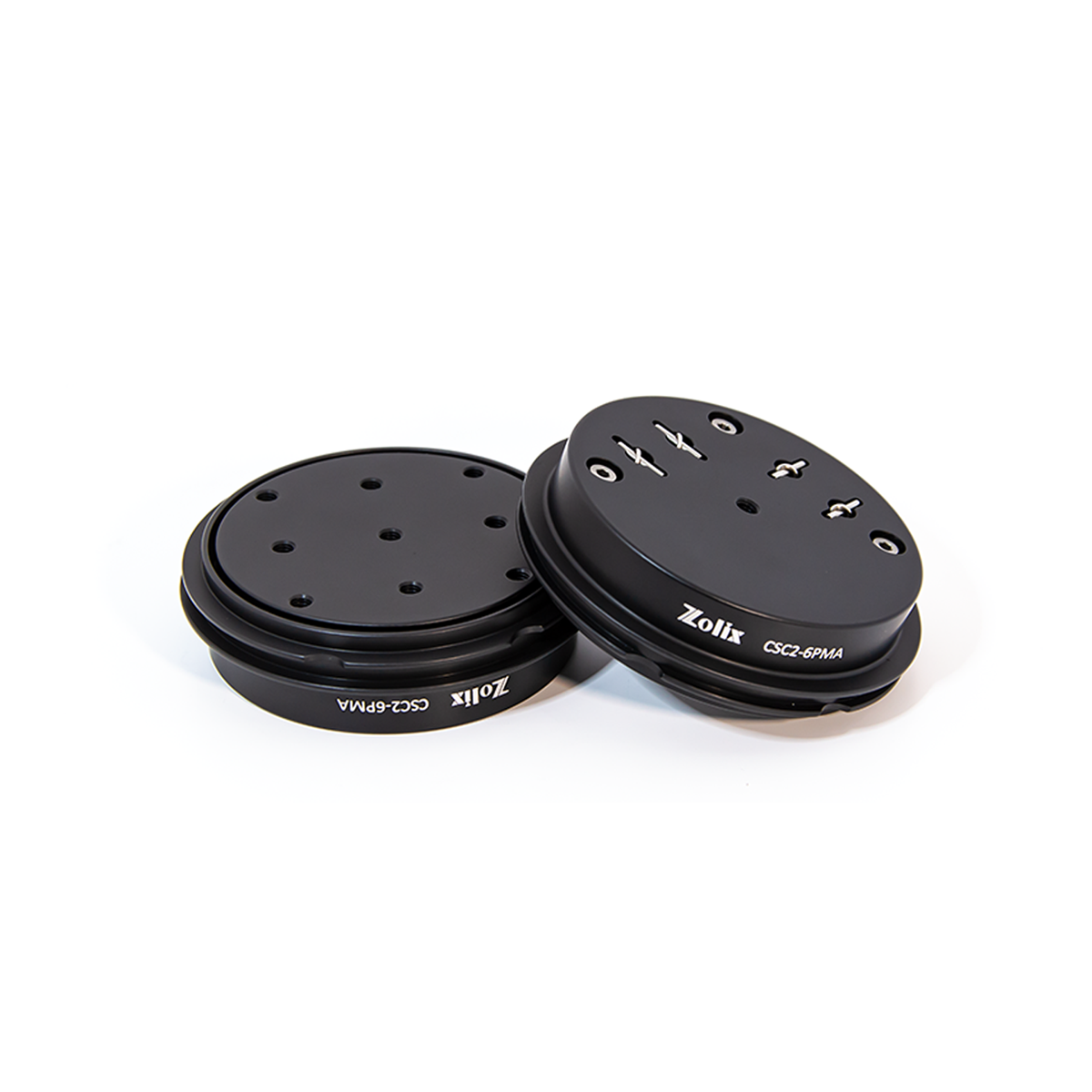ZOLIX 安裝平臺提供固定式(CSC2-6PM)與可調式(CSC2-6PMA)兩種規(guī)格,適配CSC2-SM2籠式立方頂部或底部安裝。其中固定式CSC2-6PM:臺面集成16個M4螺紋孔,底部中心設M4安裝孔,支持籠式立方內(nèi)手動旋轉粗定位。可調式CSC2-6PMA:除旋轉功能外,配備3個M5×0.25精密微調旋鈕,實現(xiàn)±3°俯仰/偏擺及Z軸6mm行程,臺面含9個M4螺紋孔,底部中心M4孔用于接桿擴展。兩種平臺均通過臺面M4孔兼容壓臂安裝,適配分束立方、棱鏡等光學元件的精密裝夾需求。