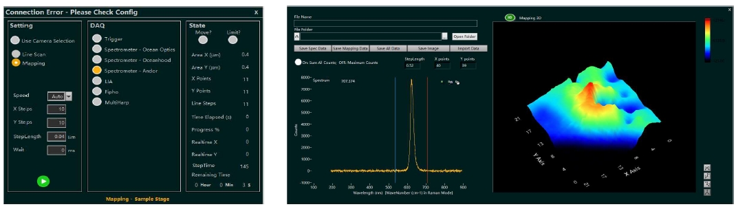 Mapping應用實現(xiàn)成像界面直接框選掃描,多種數(shù)據(jù)采集方式可選;支持常用光譜儀,熒光壽命測量系統(tǒng),鎖相放大器等采集設(shè)備。偏振掃描APP可實現(xiàn)多種偏振分辨的自動化掃描功能;Mapping測量支持實時數(shù)據(jù)處理與顯示。