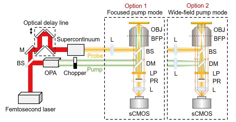 Omni-TAM900 可以有兩種成像模式(如下圖所示): 聚焦泵浦光模式(點泵浦,寬場探測)和寬場泵浦光模式(寬場泵浦、寬場探測),前者主要用于研究載流子的遷移,后者用于檢測載流子的空間分布狀況。
