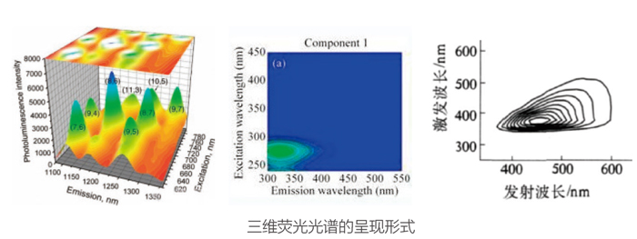 三維熒光光譜的呈現(xiàn)形式如右圖所示,左圖為三維熒光光譜數(shù)據(jù)的三維立體圖形,中間圖形為三維熒光光譜的Z軸投影,右圖為三維熒光光譜的等高線圖形。