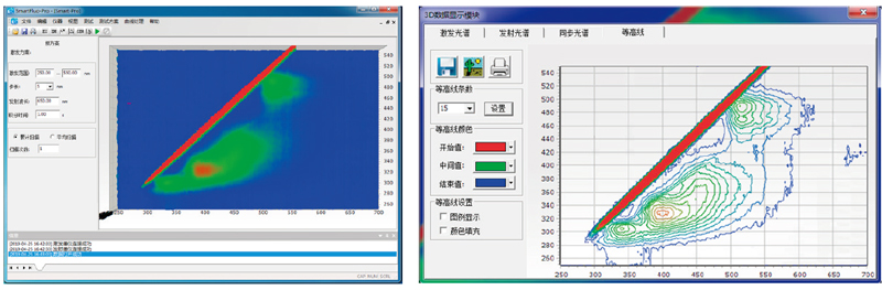 ■ 曲線處理功能模塊中的3D數(shù)據(jù)提取功能,可實(shí)現(xiàn)三維數(shù)據(jù)的等高線視圖,并能從中提取激發(fā)光譜、發(fā)射光譜、同步光譜