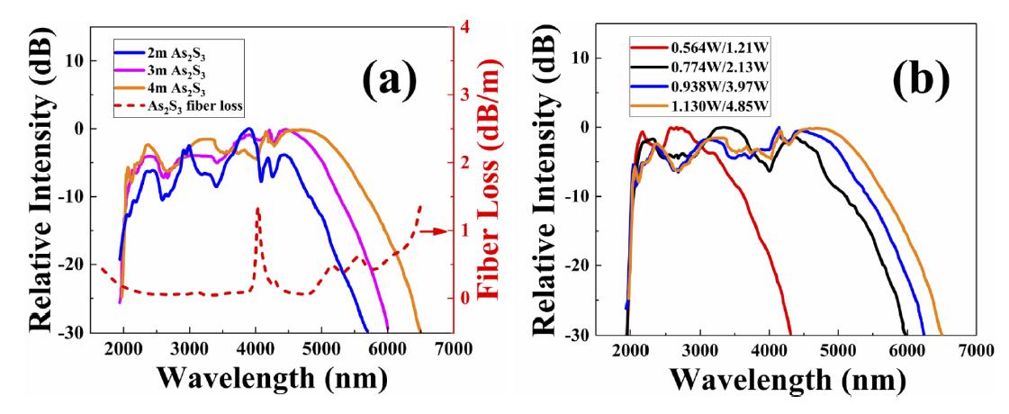 (a) 不同長度的As2S3光纖輸出光譜測量; (b) 4m As2S3 光纖在不同輸入光能量下的輸出光譜