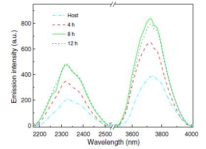1、中紅外發(fā)光硫鹵玻璃陶瓷中紅外發(fā)光研究[3],通過引入Ga2S3納米晶,極大增強了硫鹵玻璃陶瓷位于2.3和3.8μm處的中紅外發(fā)光強度。下圖為440℃不同熱處理時間下的硫鹵玻璃陶瓷中紅外發(fā)射光譜測試,淺藍曲線為主體玻璃陶瓷的發(fā)光。
