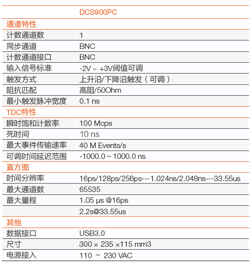 DCS900PC 時(shí)間相關(guān)單光子計(jì)數(shù)系統(tǒng)參數(shù)