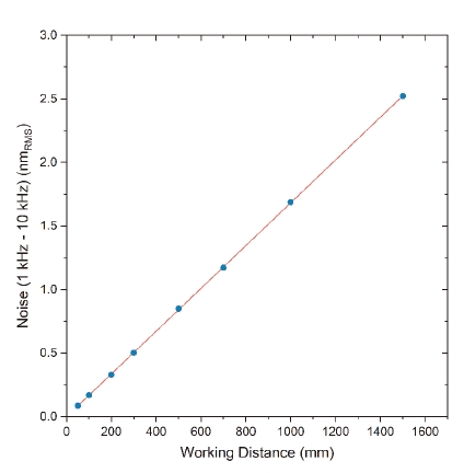 圖 1:不同工作距離下,在頻率范圍(1 kHz 至 10 kHz)內(nèi)的均方根(RMS)噪聲。噪聲隨工作 距離線性增加,歸因于激光相位噪聲的貢獻。