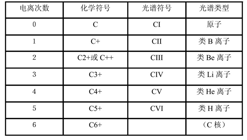 在等離子體參數(shù)較低的小型托卡馬克裝置上,等離子體的輻射主要位于真空紫外和可見光波段。下圖為捷克一個小托卡馬克裝置 CASTOR 中的等離子體發(fā)射光譜,主要在真空紫外和可見光波段。其線狀譜主要是 O,N和 C 的雜質(zhì)譜線。從等離子體發(fā)射光譜圖上可以較為容易地辨別等離子體中雜質(zhì)的種類和電離狀態(tài)。以 C 為例,譜線上標志的光譜符號和相應的電離態(tài)的關(guān)系如下表所示: