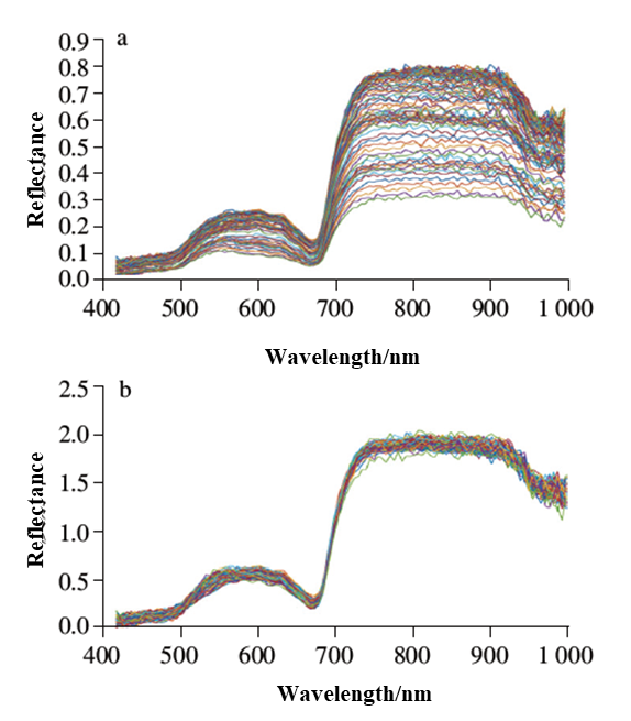 The large curvature of the surface of Camellia oleifera fruits makes the spectral intensity of each pixel point of the hyperspectral image of Camellia oleifera fruits vary considerably, so the variation in reflectance intensity must be corrected. The pixel-by-pixel spectral reflectance of the hyperspectral image is corrected using the mean normalization method.