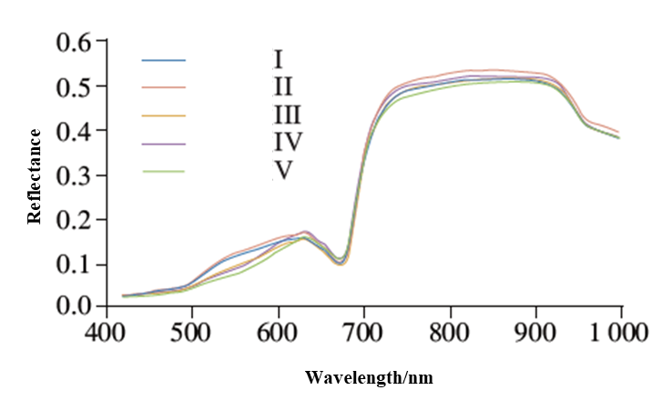 Between 720 and 970 nm, the reflectance intensity of the ripeness II-V samples decreased with increasing ripeness, while the reflectance intensity of the ripeness I-V samples increased and then decreased twice, probably due to the dynamic changes of the endogenous hormone content in the hull. The ripeness curves were significantly different at the five different harvesting time points, providing a theoretical basis for ripeness classification.