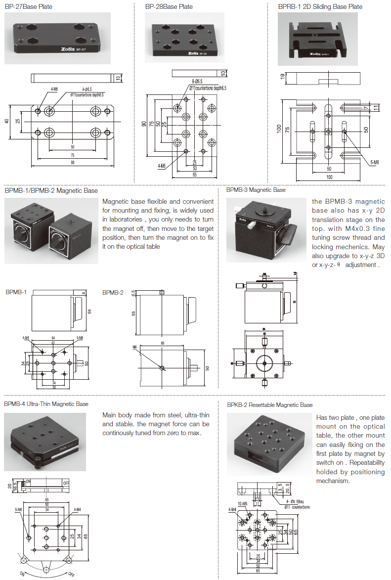 BP series base plate increases the flexibility of any optical setup by providing series of mounting holes and slots. Make it more easy to connect any optics on an optical table or breadboard.