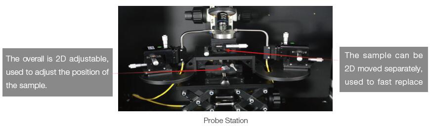 65mm diameter vacuum suction plate The probe holder and the sample on one plate is moved together, moving the sample will not affect electrode contact. Travel Range: 25 mm, Resolution: 5μm Probe holder: XYZ travel range 12 mm, resolution 0.7μm Probe: Tungsten, diameter 5μm, 10μm, 20μm are optional |
