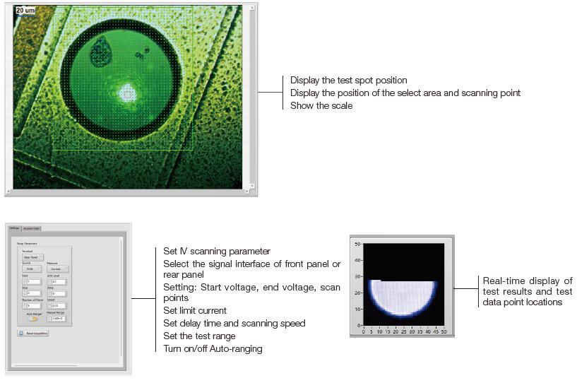 Photocurrent scanning: Set a fixed voltage, record the current of different point. I-V curve scanning: Set a voltage range to acquire I-V curve of different point The scanning area can be selected. |