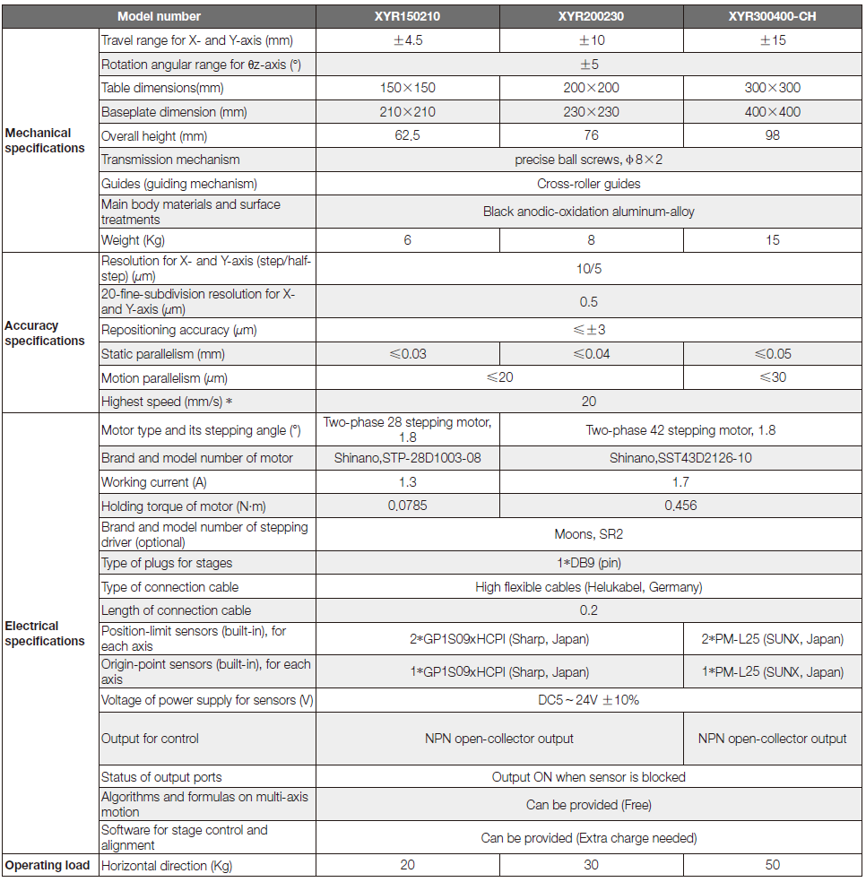 XYR series motorized all-in-one three-axis stages are parallel-type alignment systems for the workpieces which are needed to be scanned or aligned in production lines to meet requirements of high precision and high operation repetition rate. Each XYR all-in-one stage system includes upper-table, baseplate and four units of motion modular between them. Every module is guided by cross-roller guides and bearings. Three of them can be driven by short-lead ball screws, with standard stepping motors. Five-phase stepping motors and servo motors are optional. Central position of stages is used for keeping a light-through hole for transmission-type applications, or, keep a standard table without hole to meet the requirements of reflection-type operations.