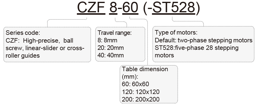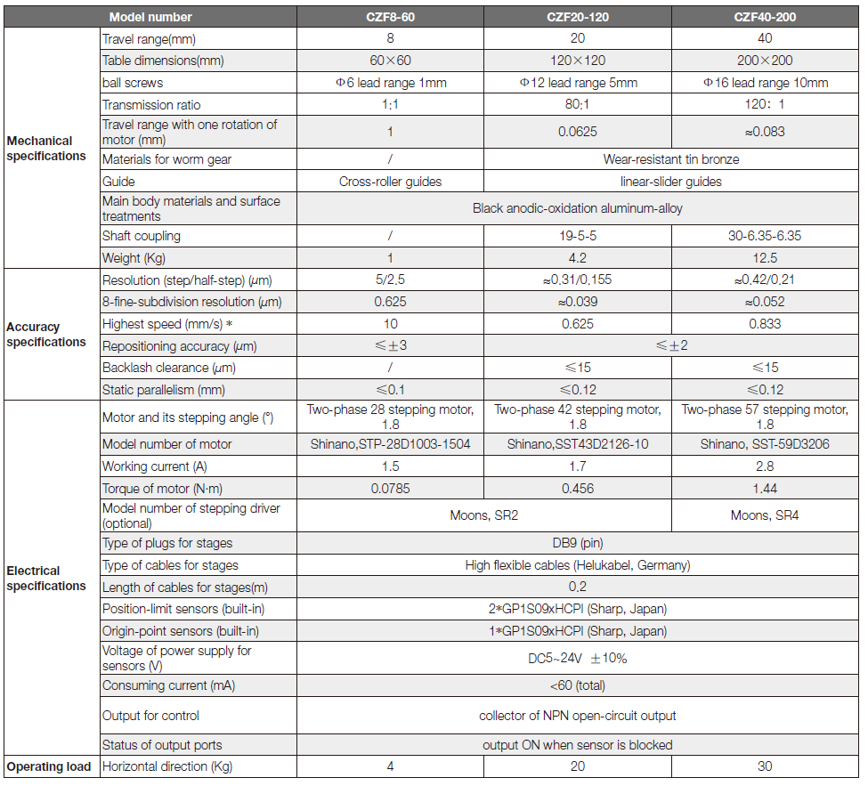 CZF series products are precise motorized vertical-motion stages designed and manufactured by Zolix to meet the requirements of applications with high-precision and high repeated operation rate. The materials of main body are hard black anodic-oxidation aluminum alloys which ensure higher durability and offers nice appearance. This series stages present higher motion precision which comes from employed linear-slider (or cross-roller) guides whose main characteristics include high strength, high loading capacity and excellent durability. The fine-grinding techniques for surface treatment of guides used in Zolix production lines also contribute to precision performance. It is imported ball screw and two-phase stepping motors (Japanese brands) that guarantee higher resolutions and positioning accuracy. This series products are ideal ones which are integrated in automation equipment or instruments which have strict requirements of space, size and weight. They are also very suitable to be employed with on-site production lines which operate in a short-travel range with higher rep
