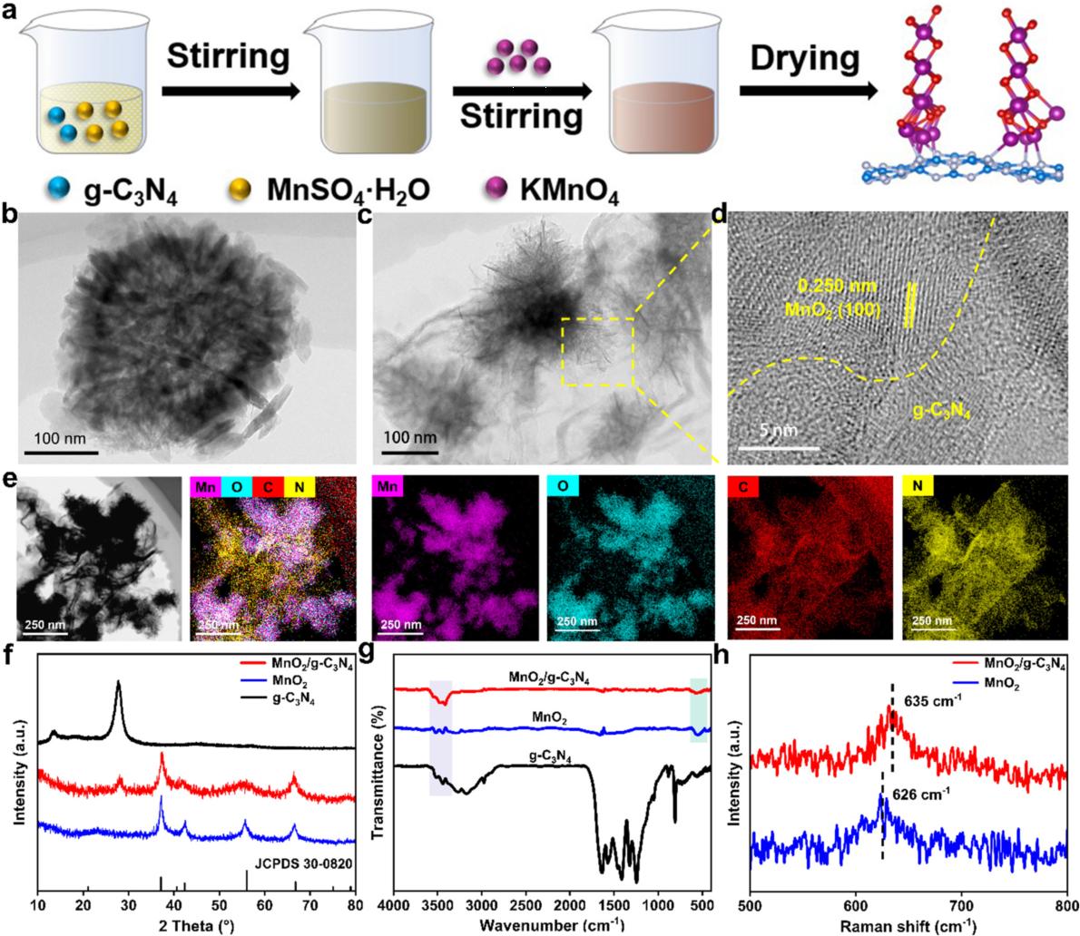 用拉曼光譜研究了MnO2與g-C3N4之間的相互作用。圖1h顯示了相比MnO2(626cm-1),MnO2/g-C3N4在635cm-1處的峰明顯右移,表明MnO2/g-C3N4中對稱的Mn-O拉伸振動增強,MnO2與g-C3N4界面相互作用增強。以上表征結(jié)果證明成功合成MnO2/g-C3N4異質(zhì)結(jié)構(gòu)。