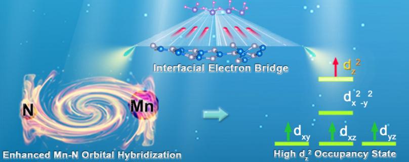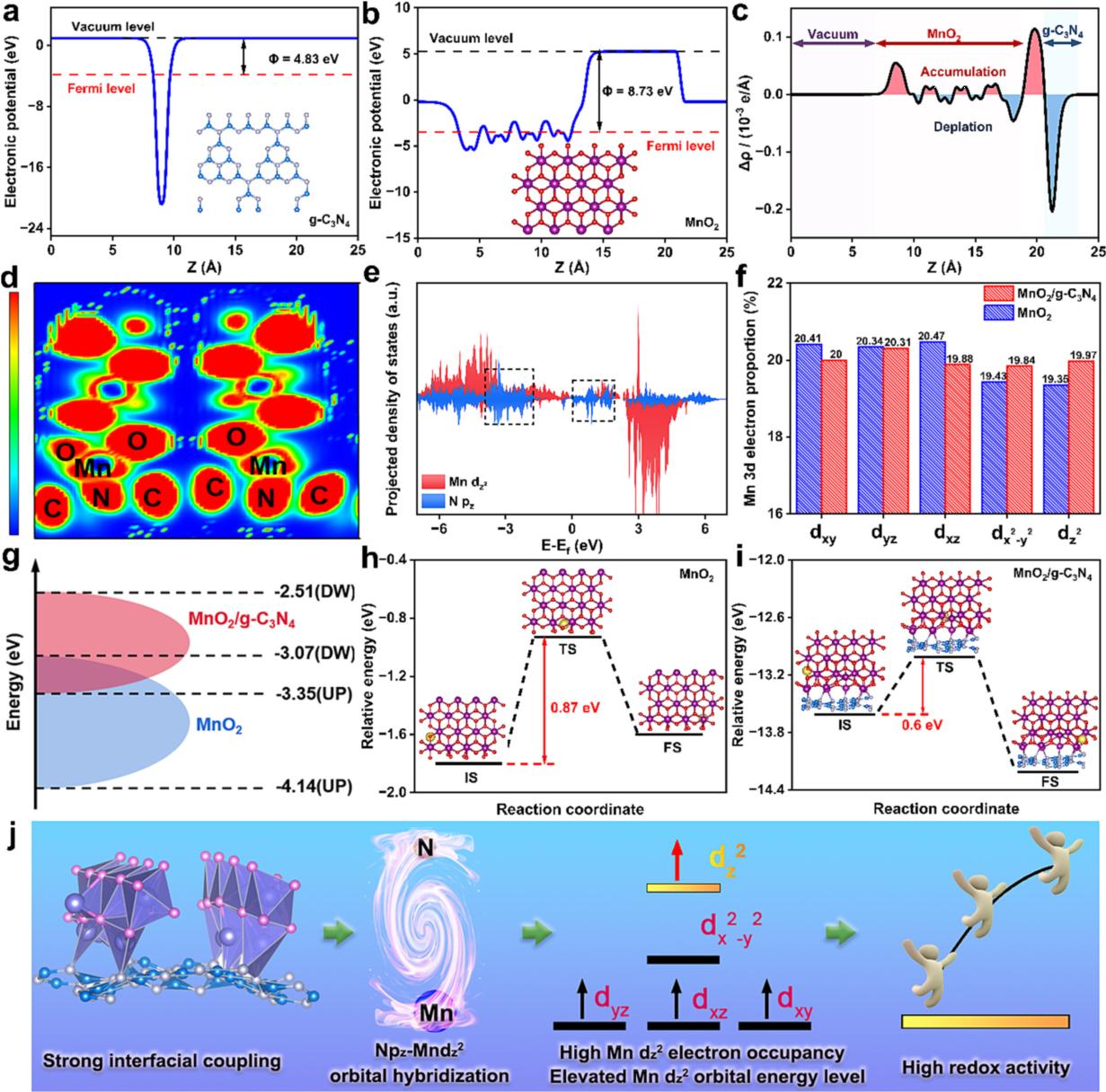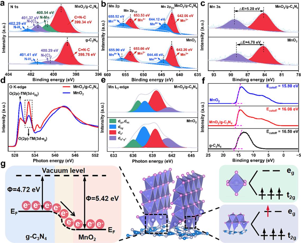 圖2 a-c) XPS圖證明, MnO2/g-C3N4中N 1s結(jié)合能的藍移和Mn 2p結(jié)合能的紅移證實了電子從g-C3N4向MnO2遷移。;d-e) sXAS圖證明了Mn-N鍵引入后,Mn與O配位的eg軌道發(fā)生了變化,MnO2/g-C3N4的dz2電子占據(jù)(50.06%)高于MnO2(29.14%)。紫外光電子能譜(UPS)結(jié)果如圖2f所示,g-C3N4的功函數(shù)低于MnO2的功函數(shù),說明電子從g-C3N4向MnO2遷移。此外,與MnO2相比,MnO2/g-C3N4的功函數(shù)更低,為5.14eV,表明電子轉(zhuǎn)移特征增強。圖2g提供了MnO2/g-C3N4中電子遷移現(xiàn)象的可視化表示,當(dāng)g-C3N4引入到MnO2框架中時,由于g-C3N4和MnO2各自的功函數(shù)不同,導(dǎo)致電子從g-C3N4向MnO2遷移。