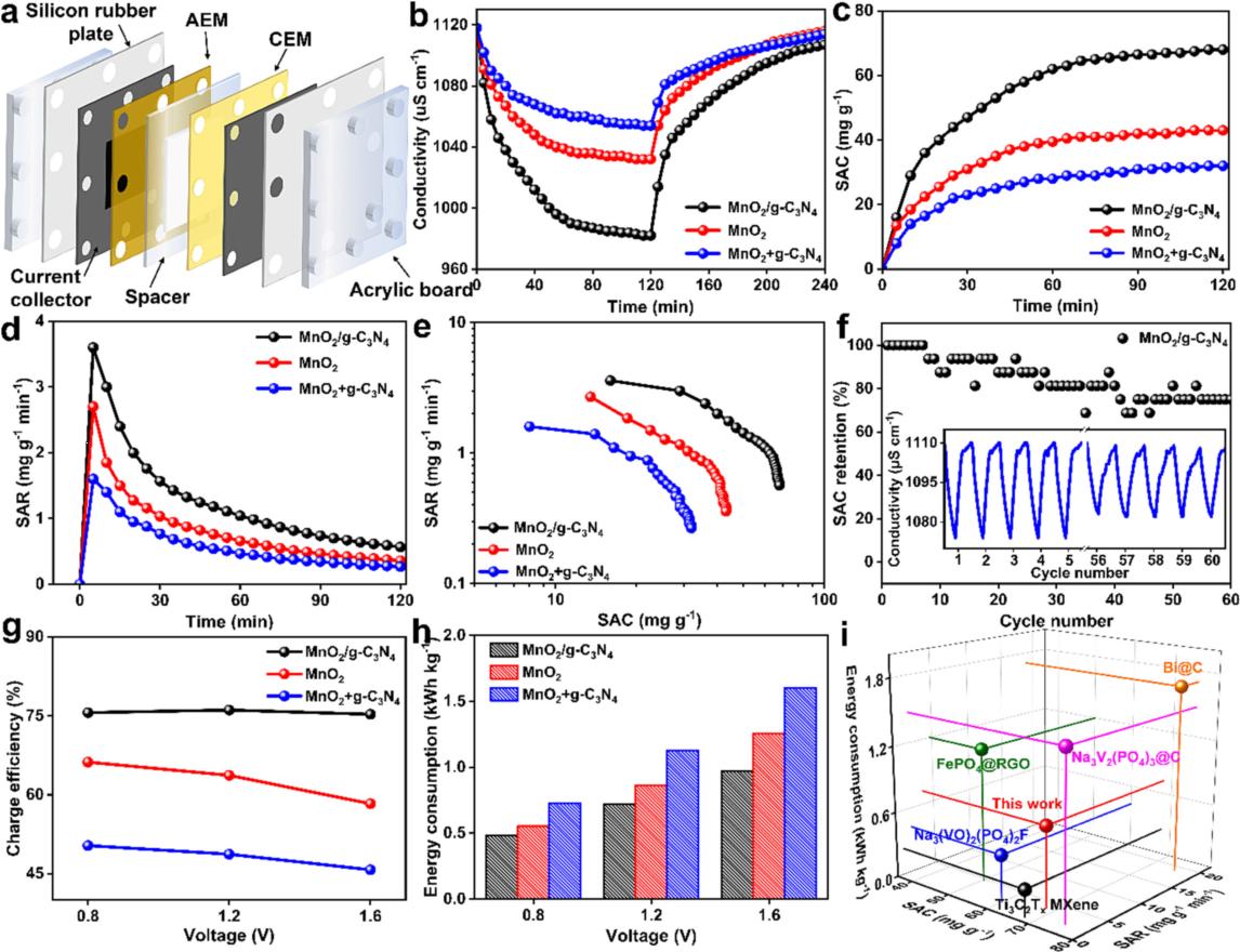 除鹽測試裝置圖如圖4a所示。電導(dǎo)率曲線如圖4b所示,圖4c為SAC隨時間的變化曲線從,圖4d為SAR曲線, Kim-Yoon圖(圖4e)證明MnO2/g-C3N4比MnO2+g-C3N4和MnO2更優(yōu)越的SAC和SAR。如圖4f表示在1.2V下循環(huán)60次后,SAC保持率始終保持在75%。圖4g可知,在不同工作電壓下,MnO2/g-C3N4比MnO2和MnO2+g-C3N4具有更高的電荷效率。此外,可以觀察到三個樣品的能耗隨著工作電壓的增加而逐漸增加(圖4h),MnO2/g-C3N4的SAC、SAR和能耗與先前報道值進行對比分析(圖4i),證明了MnO2/g-C3N4既提高了海水淡化能力,又降低了能耗。