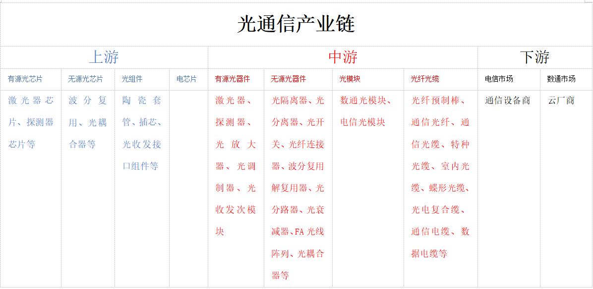 光通信產業(yè)鏈分上中下游,上游主要是核心零部件環(huán)節(jié)包括光芯片、光組件、電芯片,中游包括光器件、光模塊和光纖光纜,下游按應用場景分為電信市場和數(shù)通市場。