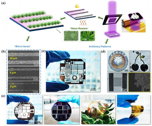 該方法的優(yōu)勢在于直接圖案化納米材料,且適用于多種金屬圖案化技術(shù),包括納米壓印和陰影掩模,適用于微米或宏觀尺度的功能材料制造。作者已經(jīng)在4厘米×4厘米的玻璃基底上展示了多種圖案,包括北京理工大學(xué)的微米級徽標和互指型微電極,證明了這一技術(shù)的通用性和對復(fù)雜形狀的復(fù)制能力。此外,該過程適用于任意剛性或柔性基底,整個制造過程在200°C以下進行,適合CMOS集成和柔性電子制造。作者在PI和PET柔性基底上成功復(fù)制了多種圖案,展示了這一方法在開發(fā)柔性和可打印微電子方面的潛力。