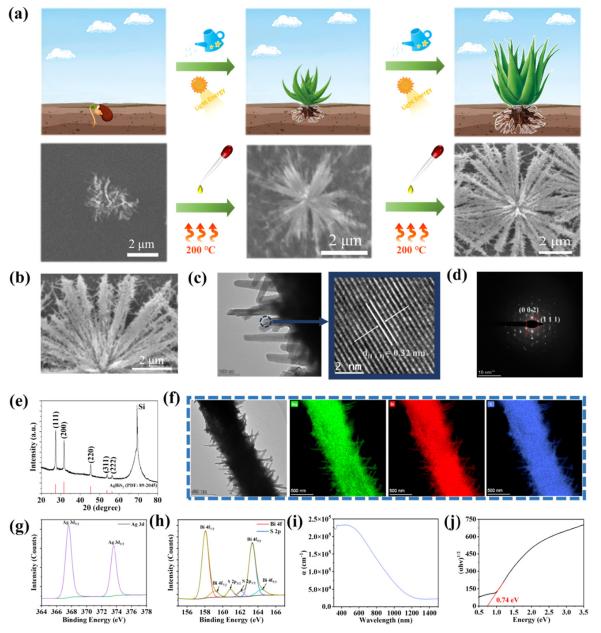 圖2. AgBiS2納米花的特性和示意圖機制。(a) AgBiS2納米花生長的不同階段的示意圖和相應(yīng)的SEM表征圖。(b) 高倍SEM圖像。(c) HRTEM圖像。(d) SAED圖案。(e) XRD圖案。(f) 元素映射顯示了Ag、Bi和S元素在AgBiS2納米花上的分布。(g和h) AgBiS2納米花中Ag、Bi和S元素的高分辨率XPS光譜。(i) 制備的AgBiS2納米花的吸收光譜。(j) 間接Tauc圖估算出0.74電子伏特的帶隙。