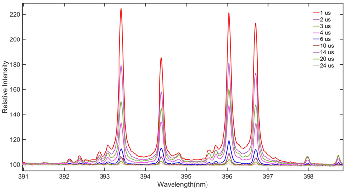 此外,我們還采集了Ca、Al以及K元素在不同延時下的光譜信號,如圖5及圖6所示??梢钥闯?,隨著采集延時的逐漸增大,光譜信號逐漸減弱,能夠有效實現(xiàn)us級別光譜信號時間分辨。
