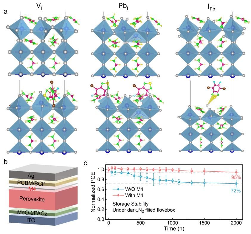 針對(duì)上述問(wèn)題,課題組選擇了一種具有多個(gè)活性位點(diǎn)的有機(jī)小分子(4,7-溴-5,6-氟-2,1,3-苯丙噻二唑)M4來(lái)鈍化鉛碘反位缺陷和碘空位缺陷。我們發(fā)現(xiàn),M4中的溴(Br)和氟(F)基團(tuán)可以與鉛(Pb)相互作用,糾正晶格畸變并鈍化碘空位(VI)缺陷和PbI缺陷。硫(S)基團(tuán)與碘協(xié)調(diào),減少I-I二聚體并鈍化IPb缺陷。經(jīng)過(guò)M4優(yōu)化后的器件效率達(dá)到了25.1%。在氮?dú)猸h(huán)境中儲(chǔ)存2000小時(shí)后,該器件保持了其初始效率的95%??傮w而言,這項(xiàng)工作突出了鈣鈦礦中多位點(diǎn)協(xié)同鈍化的優(yōu)勢(shì),并為鈣鈦礦鈍化策略提供了一種新方法。