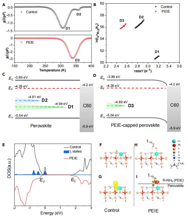 圖2 由鈣鈦礦/PEIE界面反應(yīng)導(dǎo)致的深能級(jí)陷阱鈍化 (A) 裸鈣鈦礦(對(duì)照組,黑色)和PEIE包覆鈣鈦礦器件(PEIE,紅色)的深能級(jí)瞬態(tài)譜(DLTS)信號(hào)。D1、D2和D3表示通過(guò)DLTS揭示的少數(shù)載流子的三個(gè)深能級(jí)陷阱。(B) 從DLTS信號(hào)獲得的阿倫尼烏斯(Arrhenius)圖。圖(A)中的數(shù)據(jù)點(diǎn)是通過(guò)離散拉普拉斯變換計(jì)算DLTS信號(hào)中包含的內(nèi)部瞬態(tài)得到的,而實(shí)線是對(duì)數(shù)據(jù)點(diǎn)的線性擬合。對(duì)照組(C)和PEIE鈍化(D)器件的能帶結(jié)構(gòu)以及深能級(jí)陷阱。峰的位置和高度分別對(duì)應(yīng)于D1、D2和D3陷阱的深度和密度。導(dǎo)帶*小值(EC)、價(jià)帶*大值(EV)和費(fèi)米能級(jí)(EF)均來(lái)自紫外光電子能譜(UPS)。(E) 對(duì)照組鈣鈦礦(黑色)、碘間隙缺陷(Ii,藍(lán)色)和PEIE鈍化鈣鈦礦(紅色)的態(tài)密度(DOS)。(F–I) 分別展示了具有碘間隙缺陷(Ii)的鈣鈦礦表面(對(duì)照組)和PEIE鈍化鈣鈦礦表面(PEIE)的原子結(jié)構(gòu)(F和H)以及電荷轉(zhuǎn)移(G和I)。電子的積累和耗散分別用紅色和綠色表示。