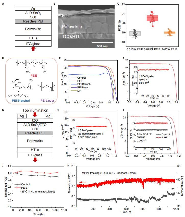 (C)不同濃度PEIE鈍化的鈣鈦礦太陽(yáng)能電池的光電轉(zhuǎn)換效率(PCE)統(tǒng)計(jì)分布。箱線圖展示了數(shù)據(jù)的五數(shù)概要:*小值、*大值、樣本中位數(shù)以及第一和第三四分位數(shù)。(D) PEI聚合物的不同構(gòu)型。(E) 使用不同PEI聚合物和LiF鈍化的p-i-n電池的J-V曲線。(F) 使用PEIE鈍化的1.65 eV p-i-n電池(面積=0.06 cm²)的J-V曲線和穩(wěn)態(tài)效率。穩(wěn)態(tài)效率通過(guò)*大功率點(diǎn)跟蹤(MPPT)獲得。(G) p-i-n頂照半透明(semi-T)太陽(yáng)能電池的器件結(jié)構(gòu)。(H) 使用PEIE鈍化的大面積(1 cm²)半透明1.65 eV p-i-n電池的J-V曲線和穩(wěn)態(tài)效率。(I) 使用PEIE鈍化的1.55 eV p-i-n電池(面積=0.06 cm²)的J-V曲線和穩(wěn)態(tài)效率。(J 和 K) 在加速條件下,PEIE鈍化的p-i-n電池的長(zhǎng)期熱穩(wěn)定性(J)和連續(xù)MPPT運(yùn)行穩(wěn)定性(K)。