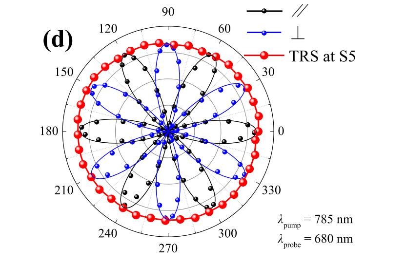 圖2展示了激發(fā)偏振依賴的TRS和SHG。SHG數(shù)據(jù)顯示出標(biāo)準(zhǔn)的6重對(duì)稱性圖案,而TRS強(qiáng)度隨著泵浦偏振的變化并沒有明顯變化,這進(jìn)一步排除了在我們的實(shí)驗(yàn)條件下MoS?片中由二階或三階光學(xué)非線性引起的TRS。