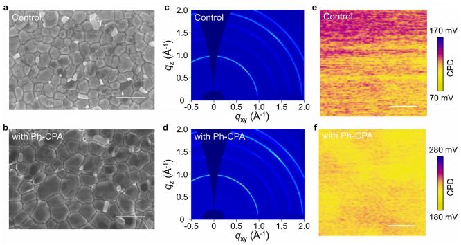 圖1 FA0.95Cs0.05PbI3薄膜的形貌和結(jié)晶性。(a)對照組和(b)添加 Ph-CPA 的鈣鈦礦薄膜的俯視掃描電子顯微鏡(SEM)圖像(標(biāo)尺為 1 微米)。(c)對照組和(d)添加 Ph-CPA 的鈣鈦礦薄膜的掠入射廣角 X 射線散射(GIWAXS)圖樣。(e)對照組和(f)添加 Ph-CPA 的鈣鈦礦薄膜的表面電勢分布(標(biāo)尺為 500 納米)。CPD代表接觸電位差。