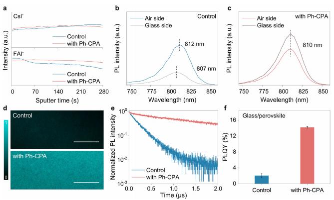 圖1 FA-Cs分布與光電特性:(a)有無摻入 Ph-CPA 的 FA0.95Cs0.05PbI? 鈣鈦礦薄膜中陽離子的分布情況,樣品結(jié)構(gòu)為玻璃 / ITO/FA0.95Cs0.05PbI?。(b)對照組和(c)添加 Ph-CPA 的鈣鈦礦薄膜從空氣側(cè)和玻璃側(cè)測得的光致發(fā)光(PL)光譜。(d)共聚焦激光掃描顯微鏡(CLSM)成像圖(標(biāo)尺為 50 微米)。(e)時間分辨光致發(fā)光(TRPL)衰減光譜以及(f)對照組和添加 Ph-CPA 的鈣鈦礦薄膜的光致發(fā)光量子產(chǎn)率(PLQY)。