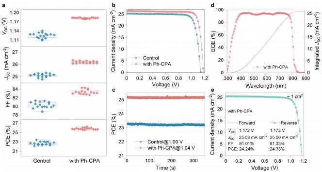 圖2 基于FA0.95Cs0.05PbI?的鈣鈦礦太陽能電池(PSC)的光伏性能。(a)有無添加Ph-CPA的16個獨(dú)立器件(孔徑面積:0.08平方厘米)的器件性能參數(shù)值(VOC、JSC、FF和PCE)。(b)有無添加Ph-CPA的*佳性能器件在反向掃描時的J–V曲線。(c)在模擬AM1.5陽光下,有無添加Ph-CPA的器件在接近*大功率點(diǎn)(MPP)偏壓下的穩(wěn)定功率輸出。(d)添加Ph-CPA的*佳性能器件的EQE光譜和積分JSC。(e)添加Ph-CPA的*佳性能1.01平方厘米器件在不同掃描方向上的J–V曲線。