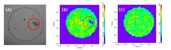 圖5A為直徑80微米的氮化鎵 Micro-LED的熒光顯微鏡明場(chǎng)成像照片。在圓形圖像的右邊可以看到一個(gè)不規(guī)則的暗區(qū)(紅圈標(biāo)注),這個(gè)暗區(qū)有可能是樣品表面的污染或者缺陷造成。5B為樣品的熒光強(qiáng)度成像,同樣可以看到MicroLED 上同一位置處的暗藍(lán)區(qū)域(紅圈標(biāo)注),表明此區(qū)域的熒光與樣品表面其他區(qū)域相比,強(qiáng)度有很大的降低。單從圖5A和5B,難以對(duì)此異常區(qū)域形成的原因做出有效的推測(cè),因?yàn)闃悠繁砻娴奈廴净蛘呤悄撤N形式的能量轉(zhuǎn)移均能造成熒光強(qiáng)度的降低。為了進(jìn)一步探尋原因,我們使用了熒光壽命成像(圖5C)。從圖中可以看到,前兩個(gè)圖中的異常區(qū)域消失了,這意味著此異常區(qū)域并無(wú)缺陷存在,因?yàn)槿毕輰?dǎo)致的能量轉(zhuǎn)移一般會(huì)伴隨熒光壽命的減小,因此可以推斷,在圖5A和圖5B中測(cè)到的異常區(qū)域應(yīng)為某種污染所導(dǎo)致。