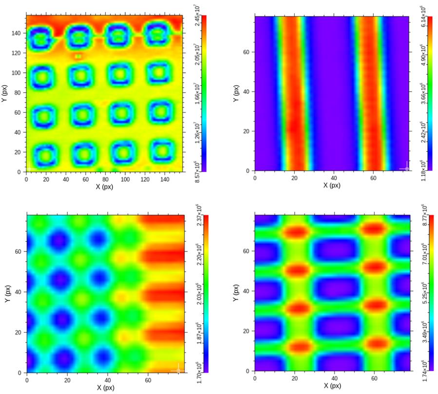 圖案化表征QLED是一種基于量子點(diǎn)的新型發(fā)光技術(shù),具有發(fā)光亮度高、色域?qū)?、可溶液加工等特點(diǎn),通過(guò)適配光刻、噴墨打印等量產(chǎn)工藝,可分別滿足中大尺寸和微顯示屏的應(yīng)用需求。通過(guò)不同的光刻膠工藝可制備各種有趣的紅光Micro-QLED圖案。圖6為在OmniFluo-FLIM熒光壽命成像顯微鏡下獲取的熒光強(qiáng)度成像(PL Mapping),橫坐標(biāo)標(biāo)尺單位為μm。