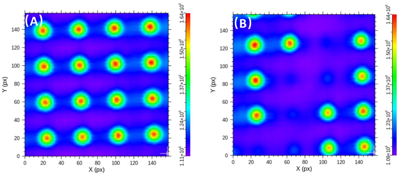 圖8. Micro-LED 的PL Mapping圖(A)正常圖案;(B)部分量子點(diǎn)脫落圖案