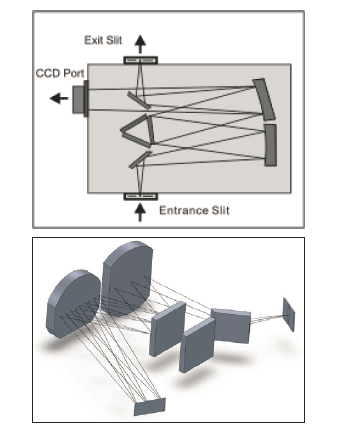 當一束復合光線進入單色儀的入射狹縫,首先由光學準直鏡匯聚成平行光,再通過衍射光柵色散為分開的波長(顏色)。利用每個波長離開光柵的角度不同,由聚焦反射鏡再成像出射狹縫。通過電腦控制可精確地改變出射波長。