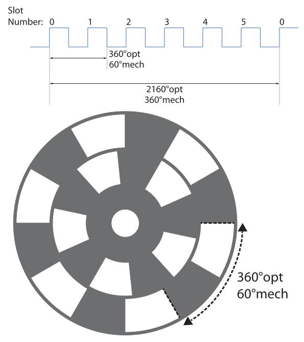 具有 n 個(gè)槽的光學(xué)斬波輪每機(jī)械旋轉(zhuǎn) 360°,將前進(jìn) n×360°opt(光學(xué)角度)。我們將這些單位指定為光學(xué)度數(shù) (°opt) 和機(jī)械度數(shù) (°mech)。圖 2 顯示了 6 槽葉片的區(qū)別。